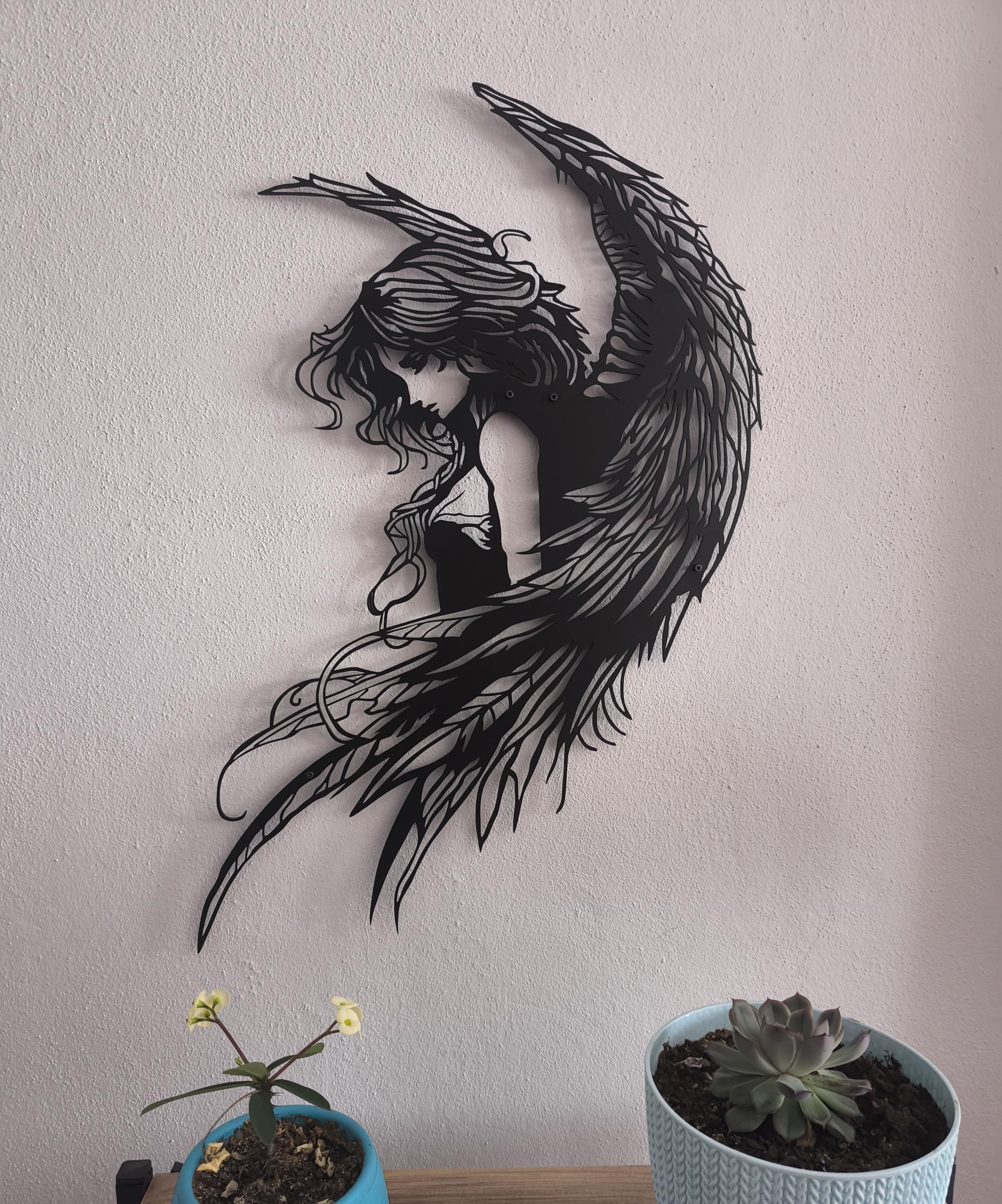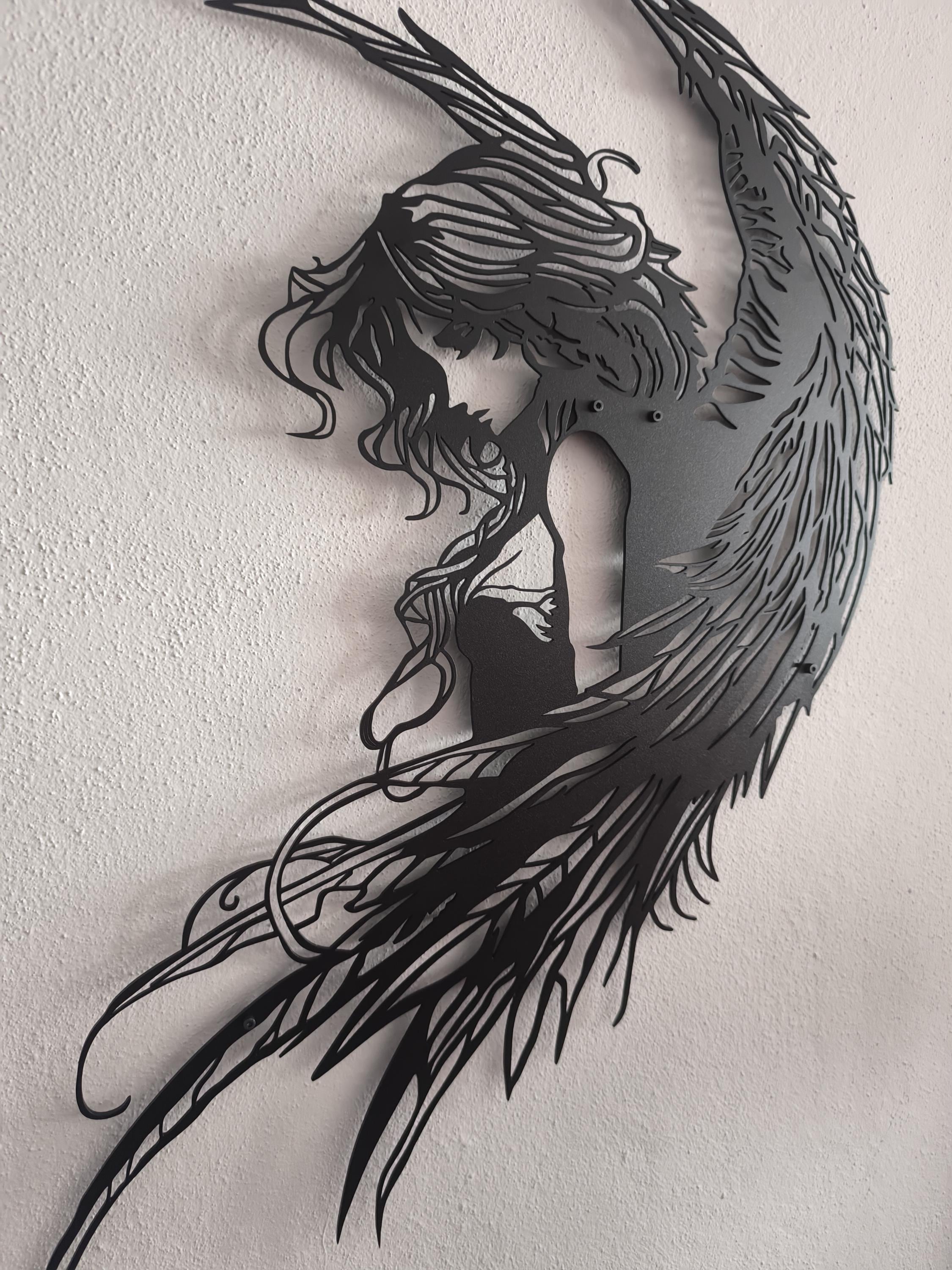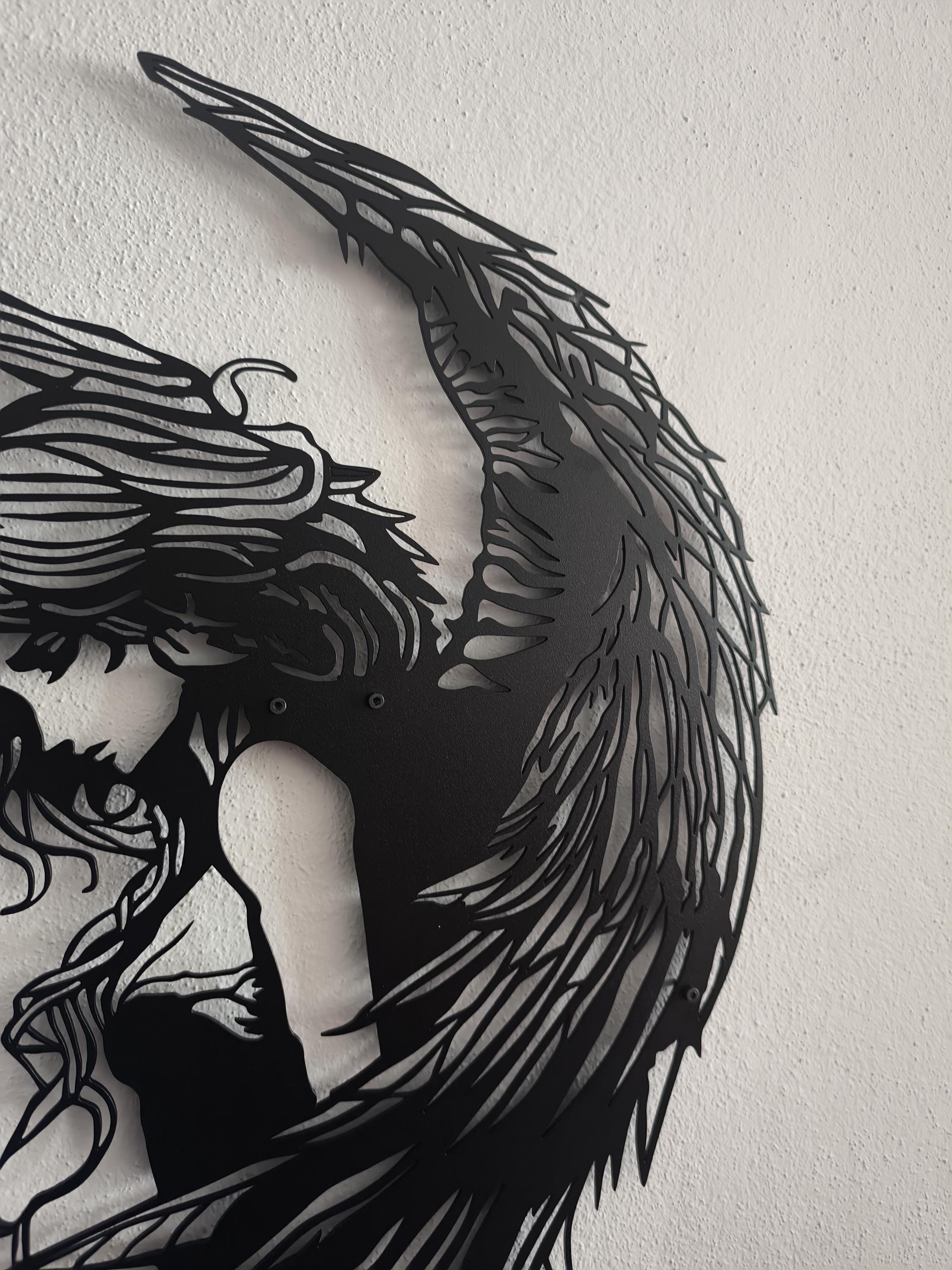 ๐ธEmbrace the drama and beauty of the mystical realm with our Fallen Angel Metal Wall Decor. This captivating piece features a highly detailed silhouette of a sorrowful or contemplative winged female figure. With flowing hair and impressive, intricate wings, this art perfectly captures the Gothic and romantic aesthetic of a dark angel or ethereal fairy.