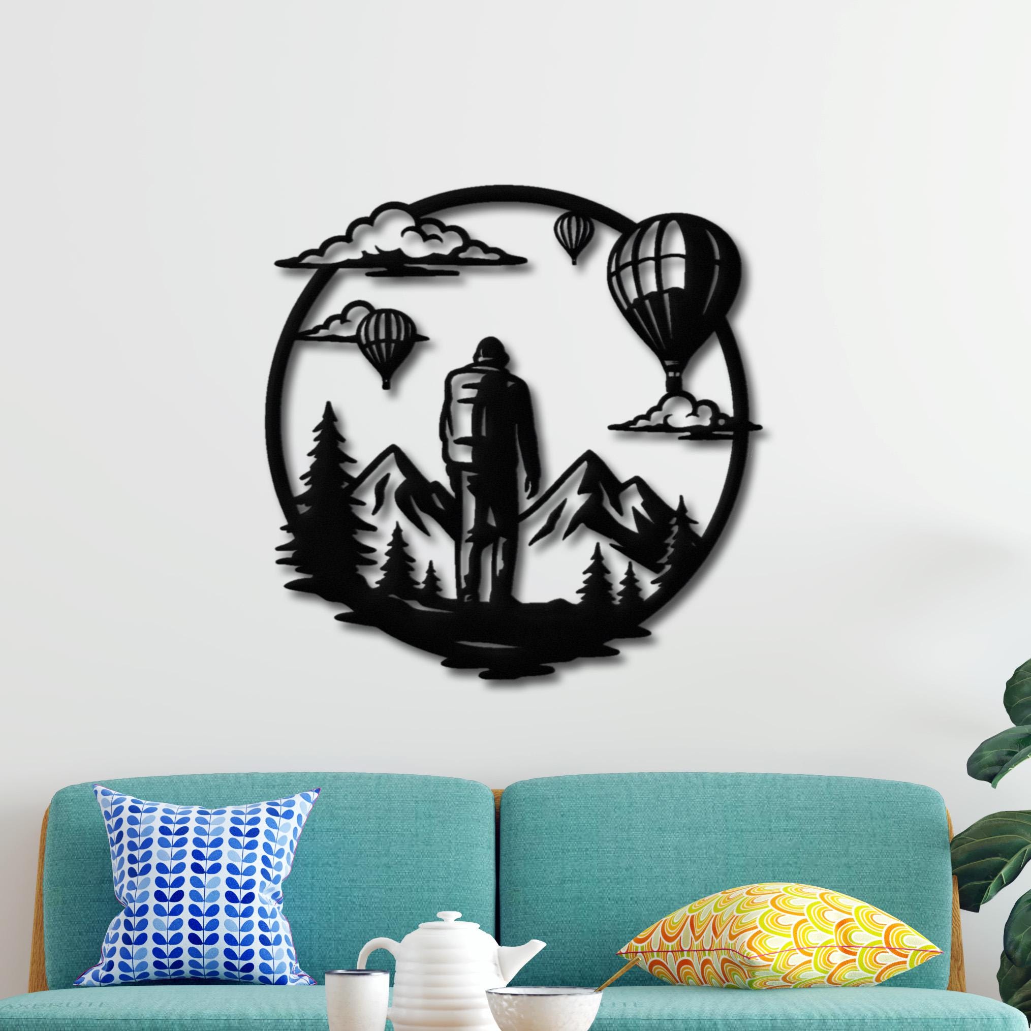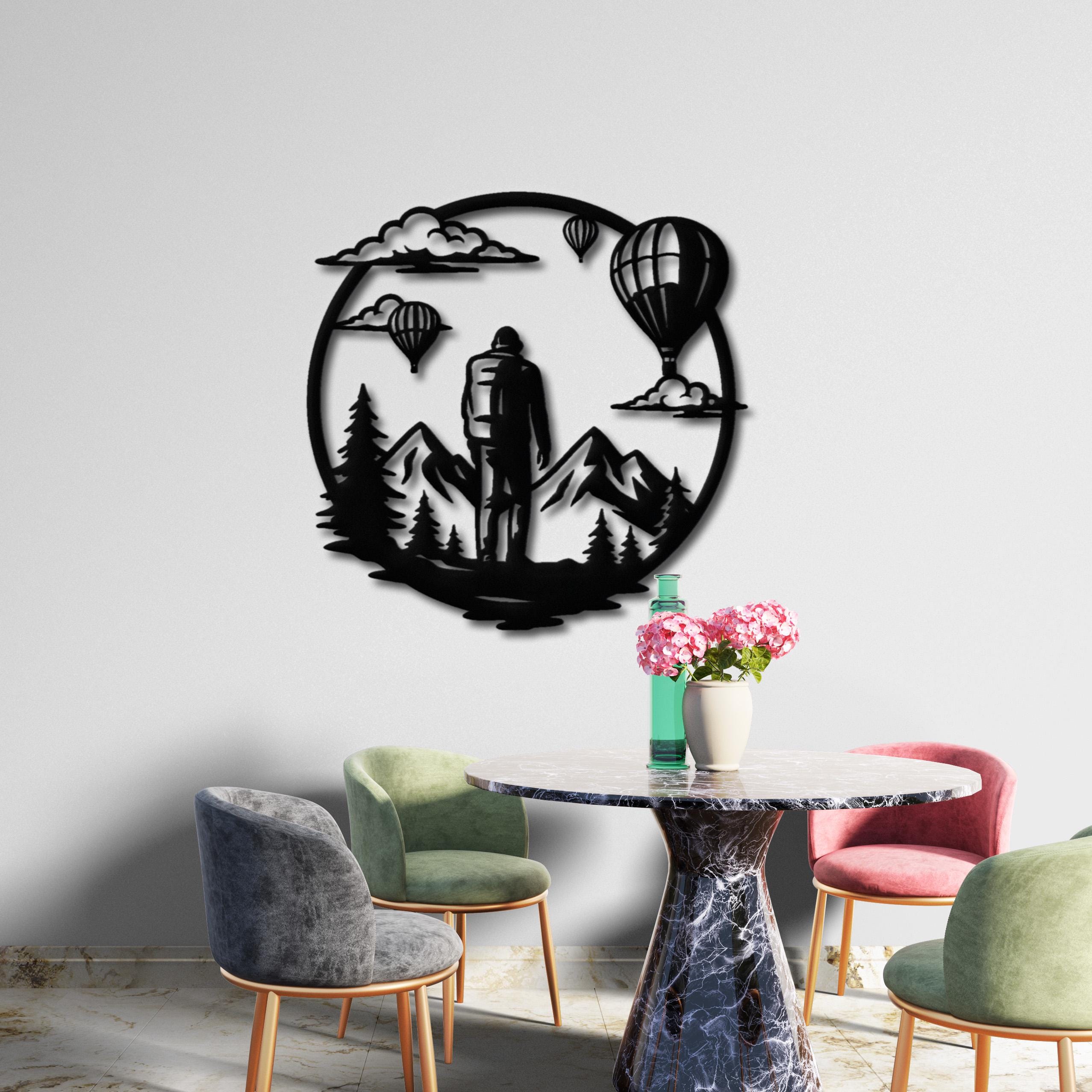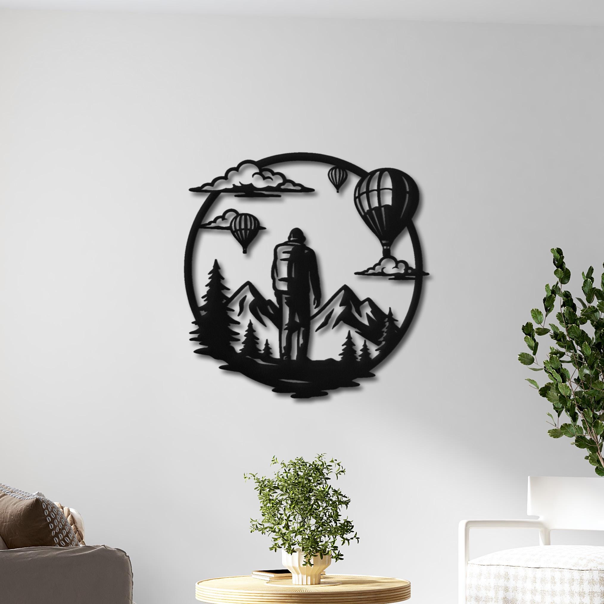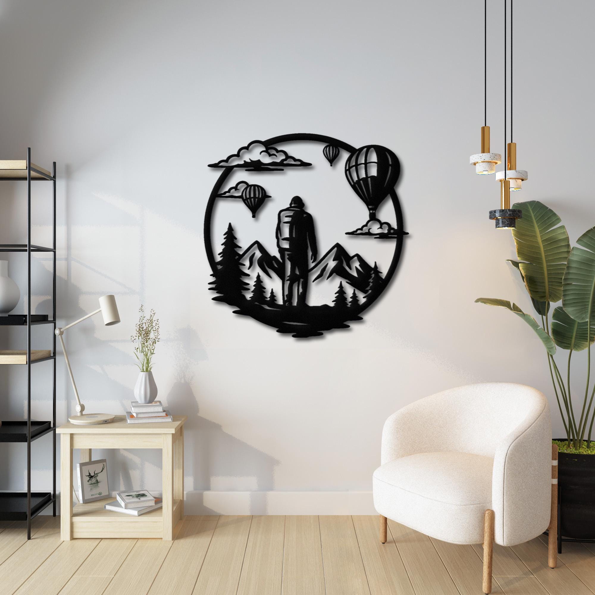πΈ Capture the spirit of adventure with this stunning Circular Metal Wall Art. This piece features a lone hiker with a backpack, standing atop a mountain, gazing out at a serene landscape of pine trees and hot air balloons rising through the clouds. It's a powerful symbol of travel, wanderlust, and the breathtaking beauty of nature.