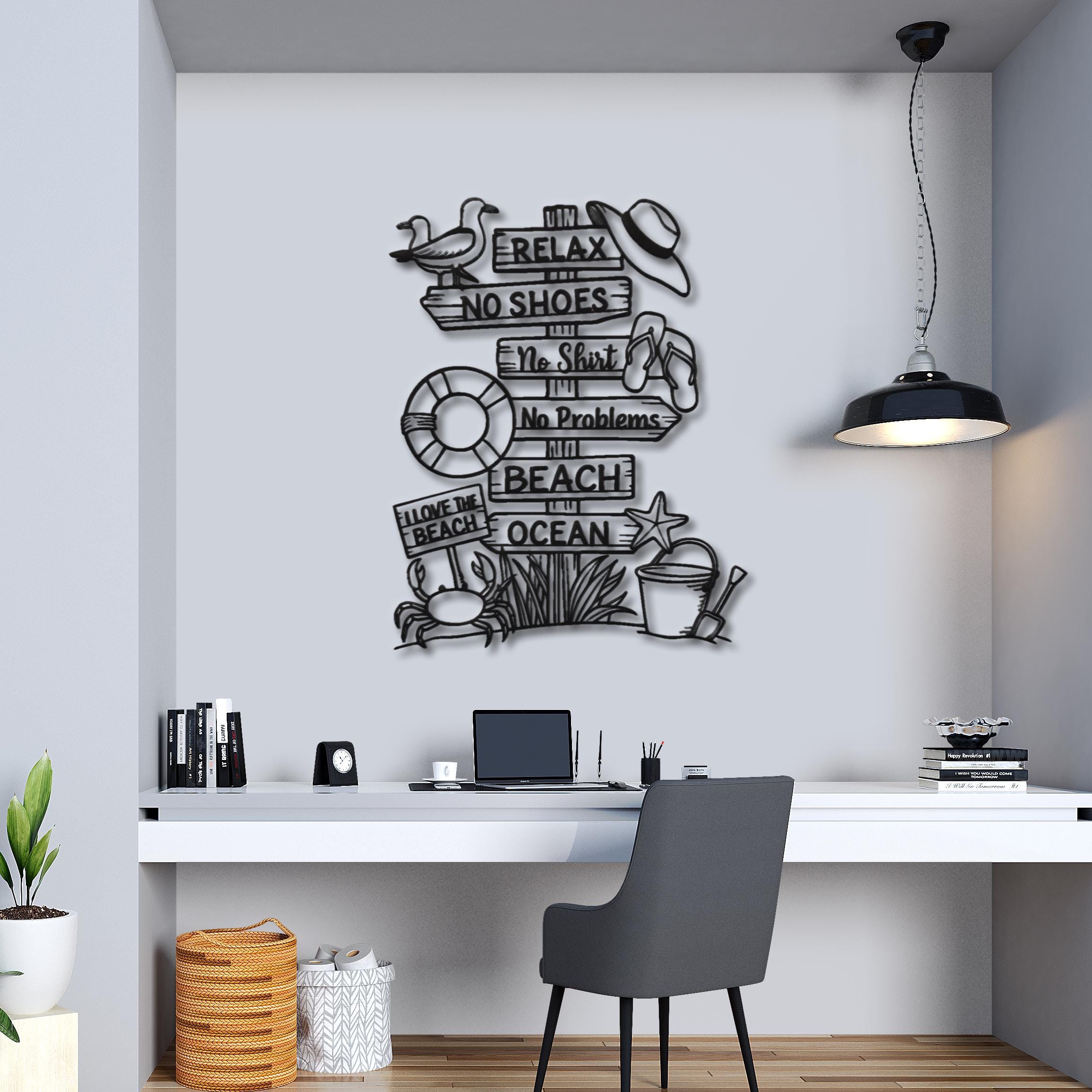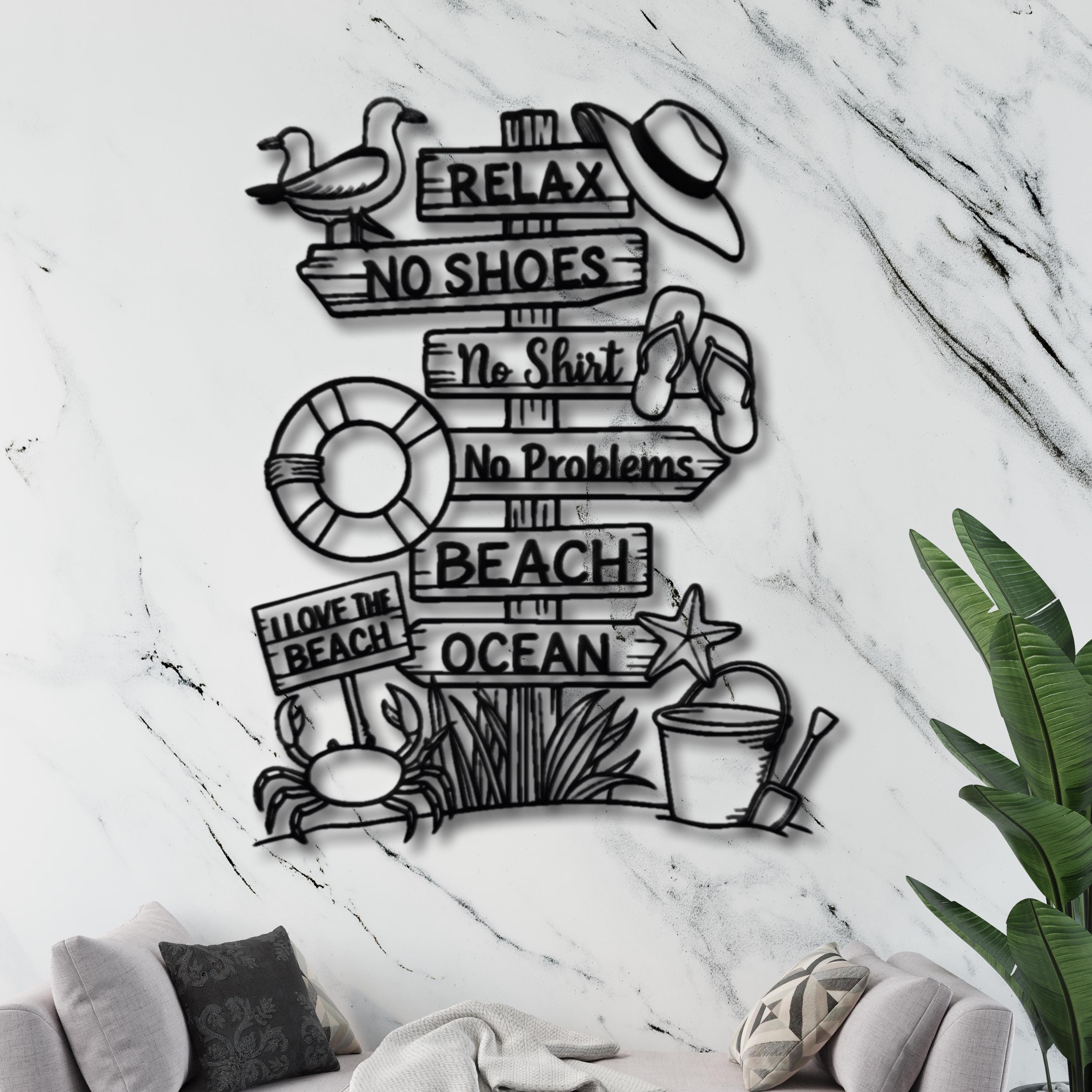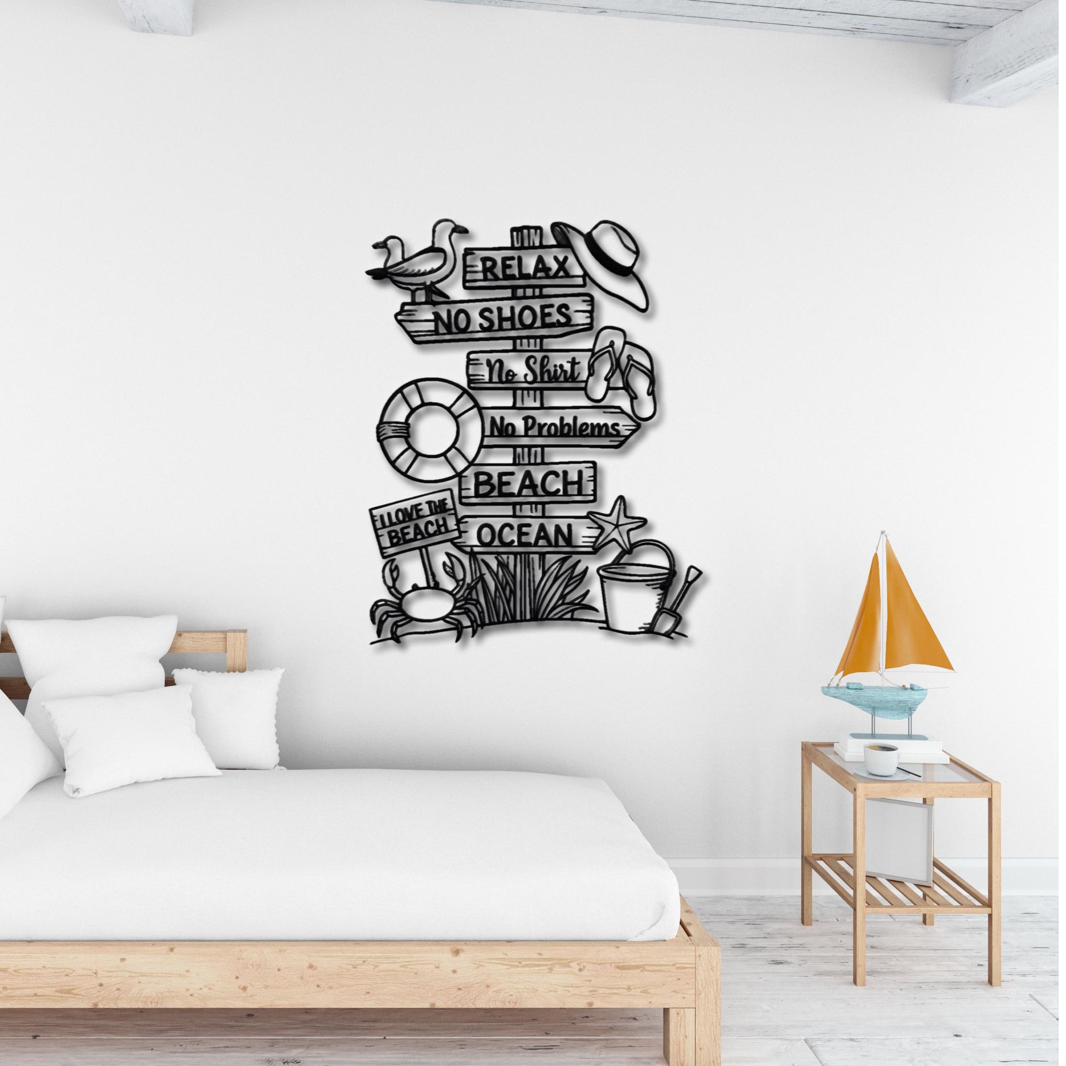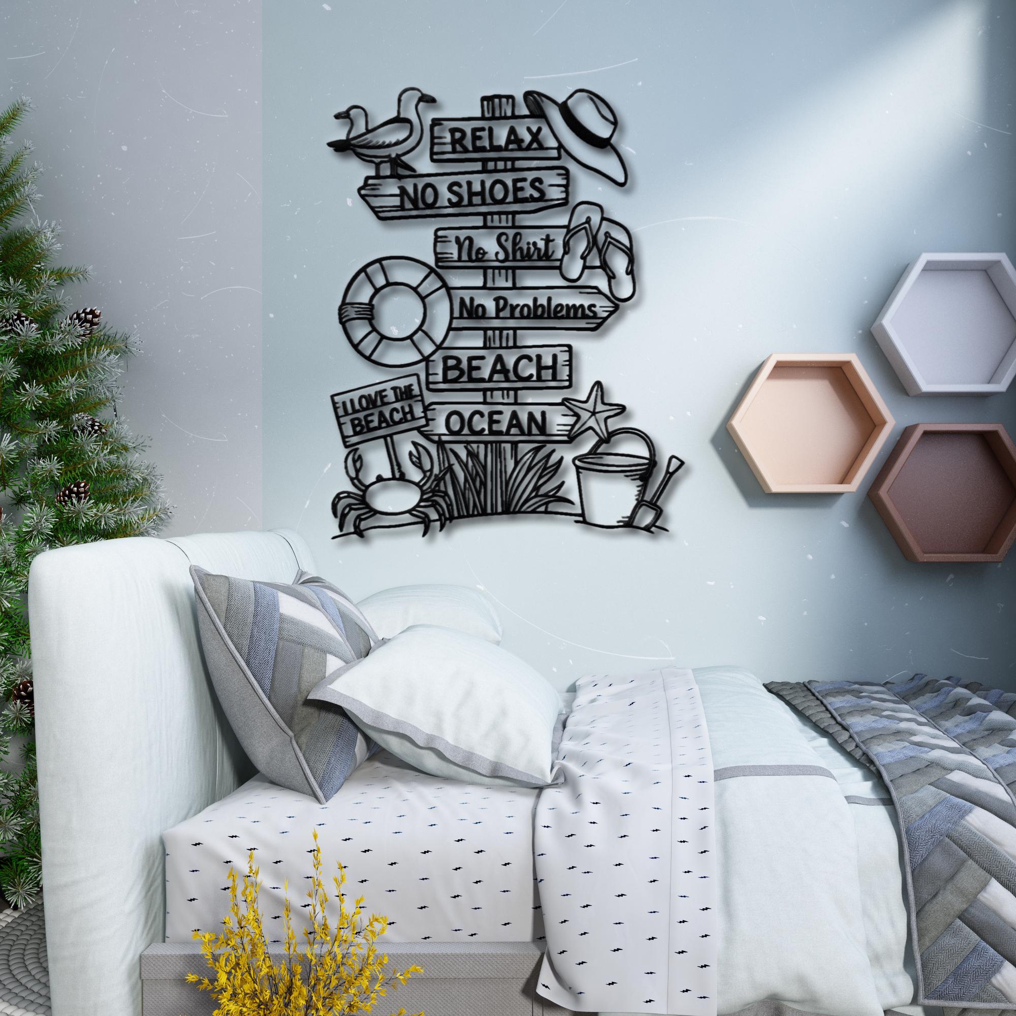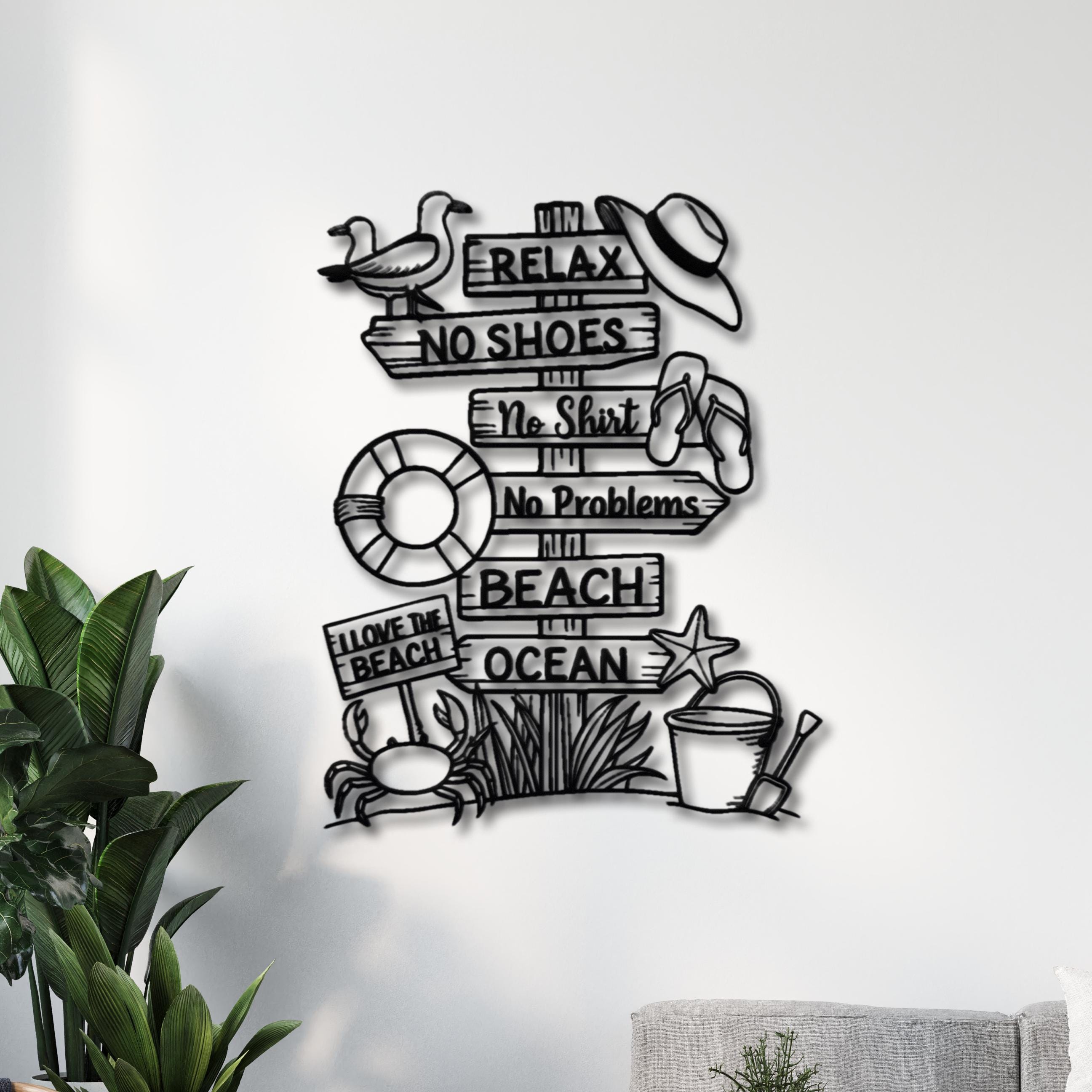 🔸 This fun and relaxing Beach Sign Metal Wall Decor brings the carefree spirit of summer into your home. Featuring playful phrases like “Relax”, “No Shoes”, “No Shirt”, and “No Problems”, along with beach elements such as flip-flops, starfish, and ocean vibes, this piece creates a warm and joyful coastal atmosphere.