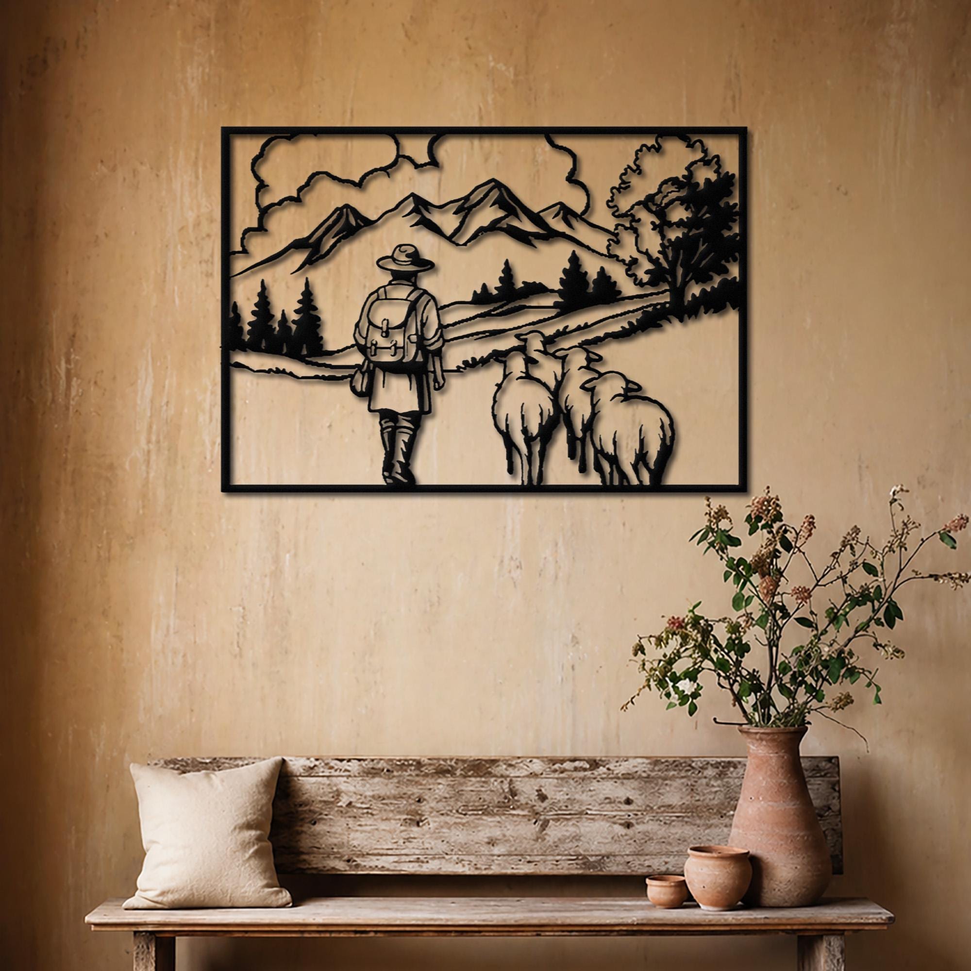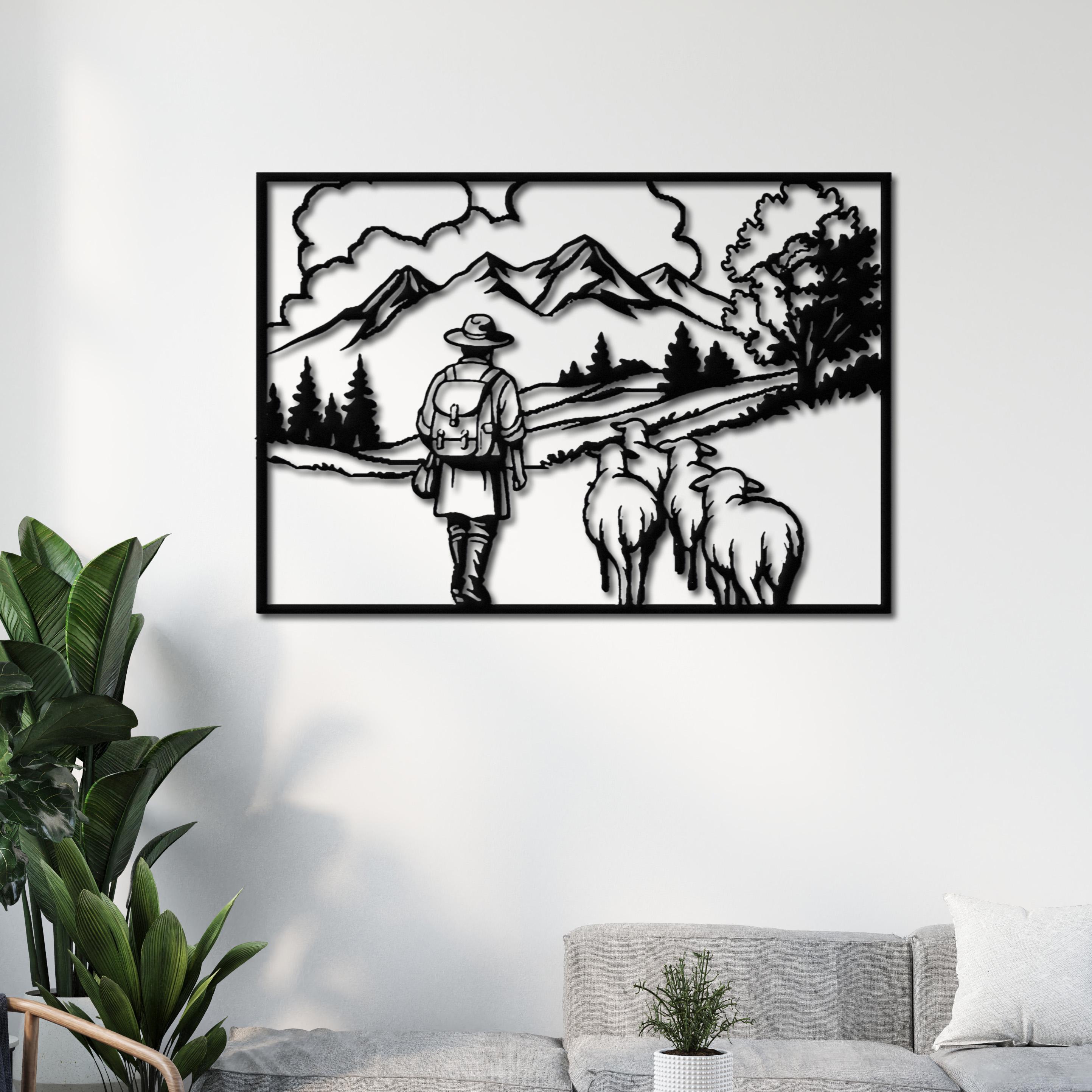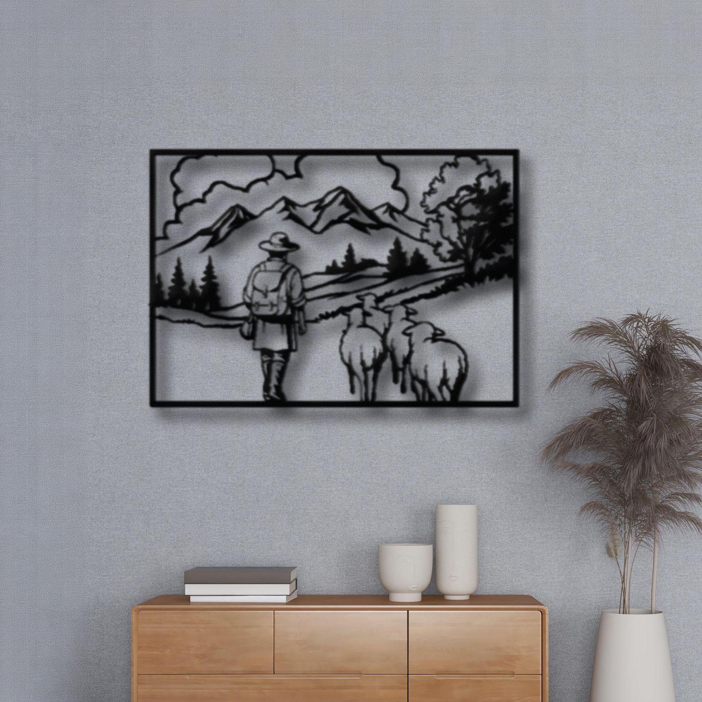 πΈ This beautifully detailed metal wall art captures a peaceful countryside scene of a shepherd walking with sheep through a scenic mountain landscape. The minimalist silhouette design evokes calmness, simplicity, and a deep connection to nature, making it a perfect statement piece for rustic and farmhouse interiors.